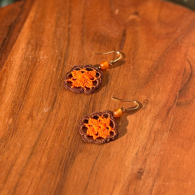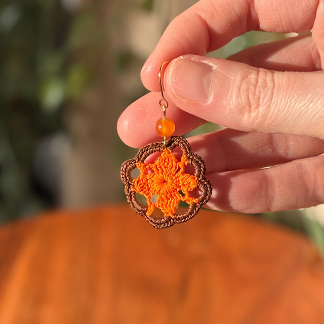 Ces boucles d’oreilles sont réalisés en micro crochet à la main avec un fil de coton très fin, dans un motif ajouré aux lignes florales et géométriques.