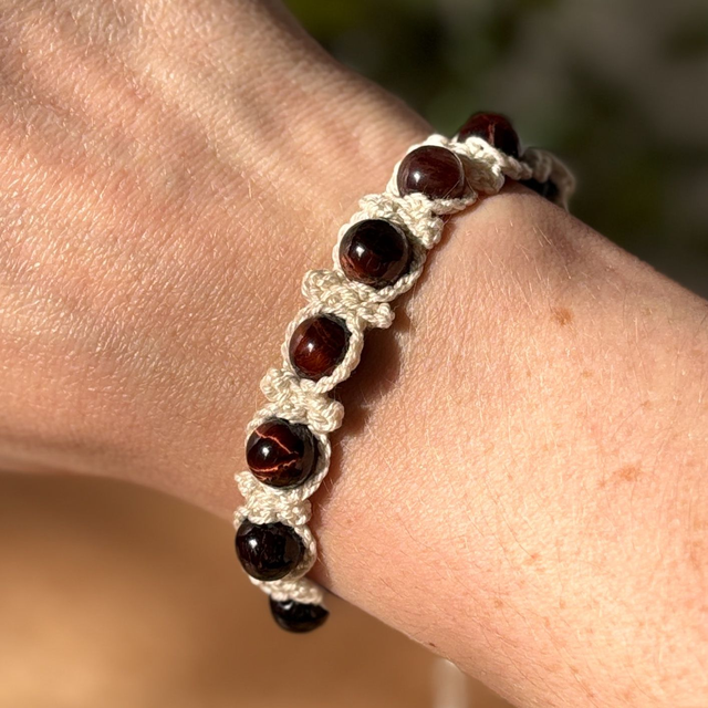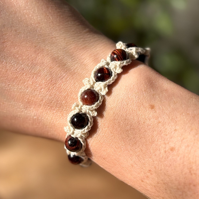 Crocheté à la main avec un fil de coton mercerisé beige, ce modèle Dharma est orné de pierres d’œil de taureau.