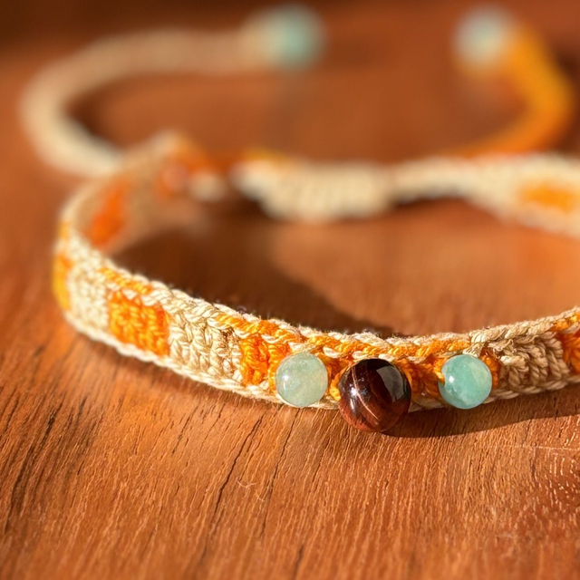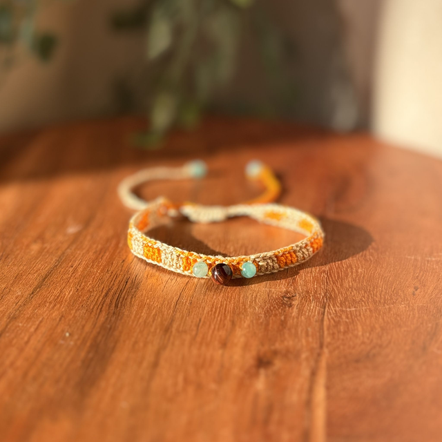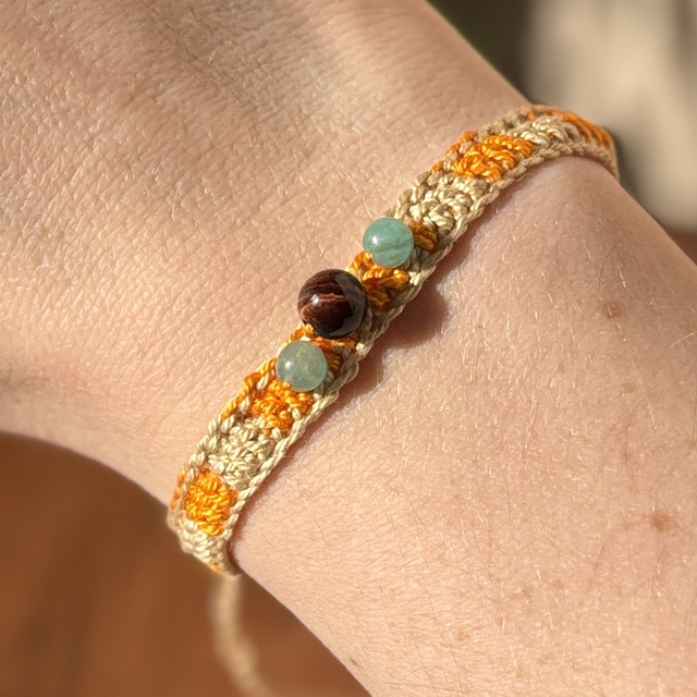 Ce bracelet Prana mise sur un mariage de couleurs franches : un coton câblé beige naturel entrelacé d'un orange vif. Au centre, j'ai associé l'œil de taureau pour ses reflets brun-rouge et l'amazonite pour sa nuance bleu-vert un peu givrée.