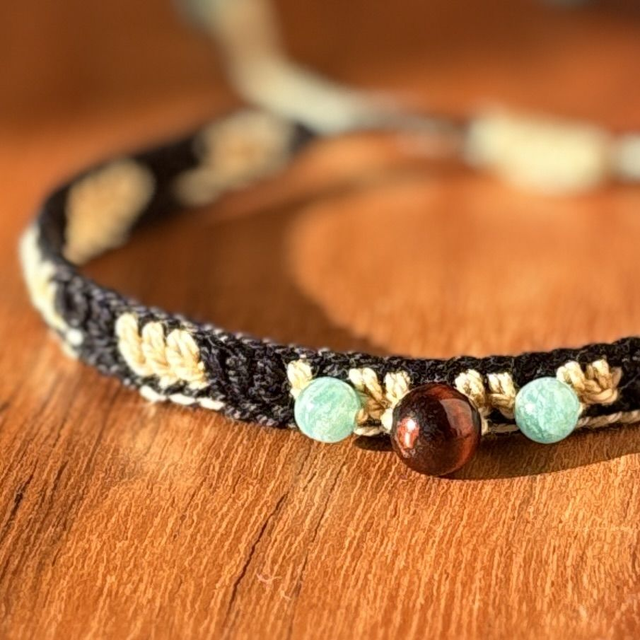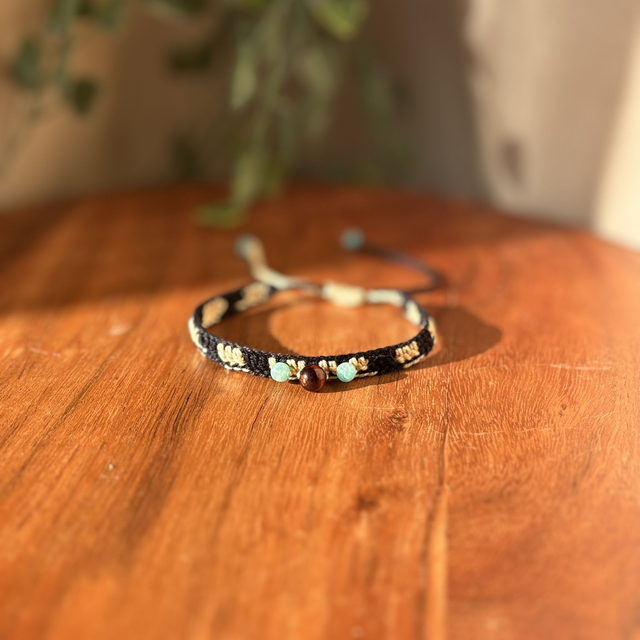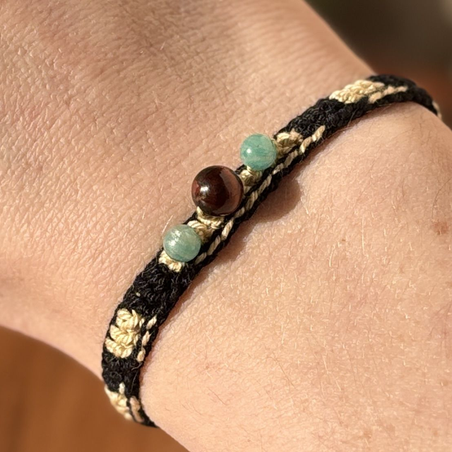Ce bracelet Prana se joue des contrastes avec un coton câblé noir profond et beige crème. Pour le centre, j’ai choisi l’œil de taureau pour ses nuances brun-rouge, entouré de deux perles d’amazonite pour apporter une touche de clarté bleu-vert.