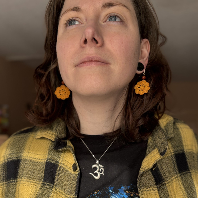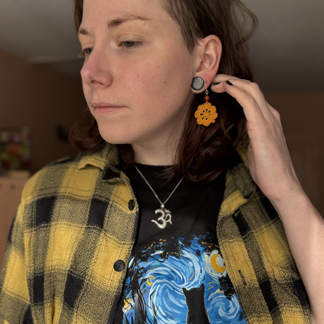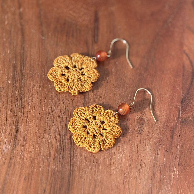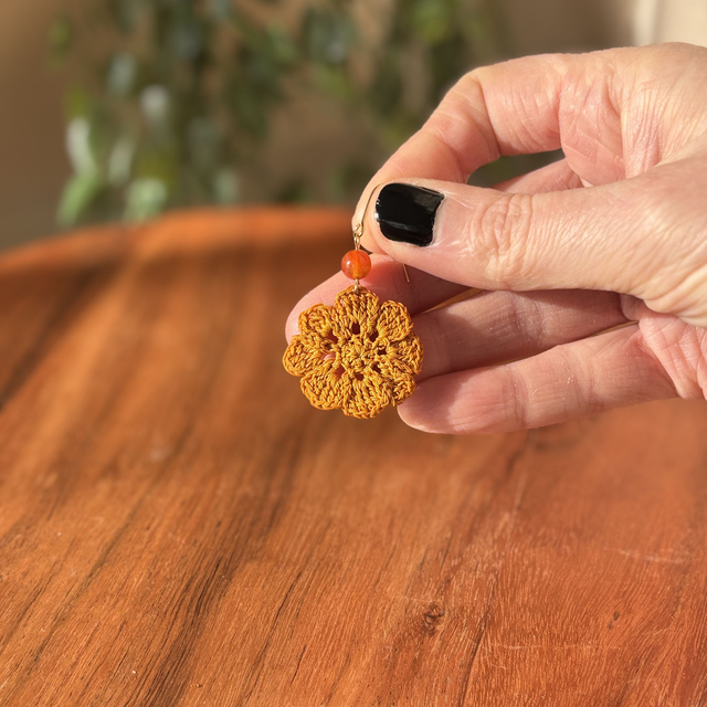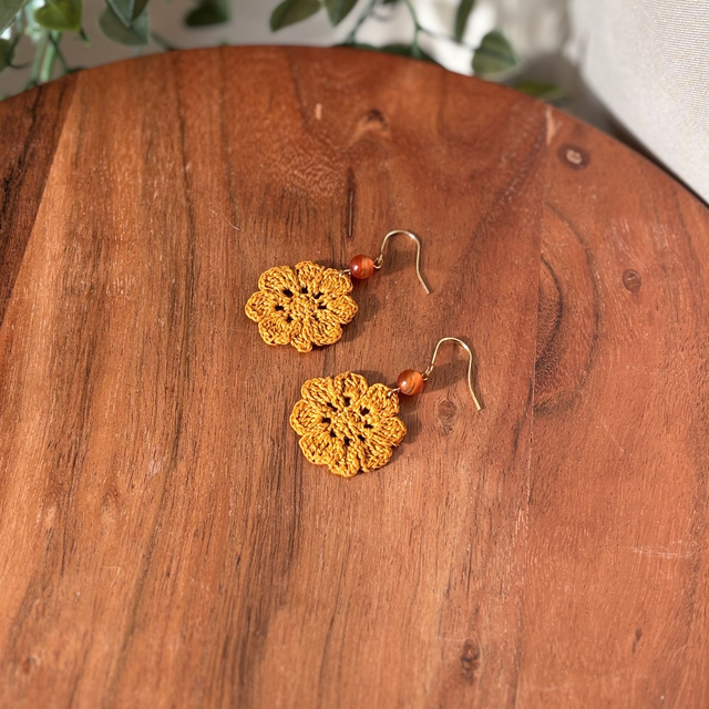 Ces boucles d’oreilles sont réalisés en micro crochet à la main avec un fil de coton très fin, formant une fleur vibrante et solaire.
