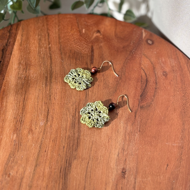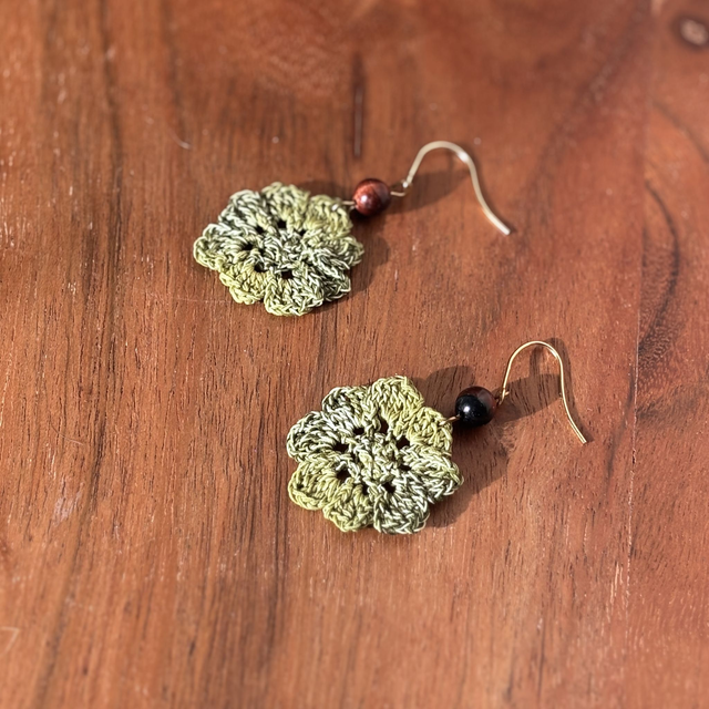 Ces boucles d’oreilles sont réalisés en micro crochet à la main avec un fil de coton très fin, formant une fleur vibrante et solaire.