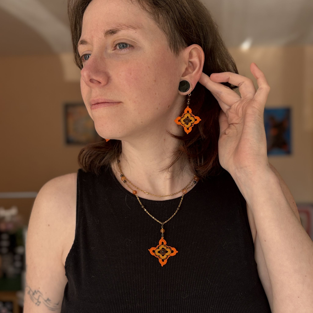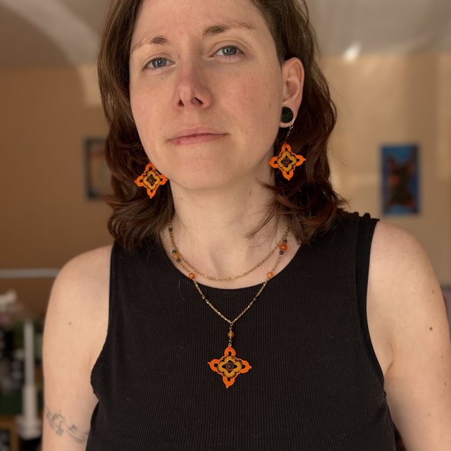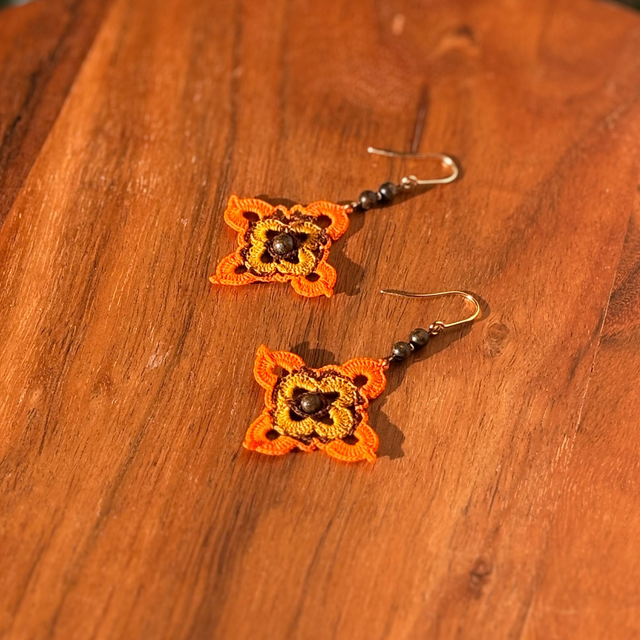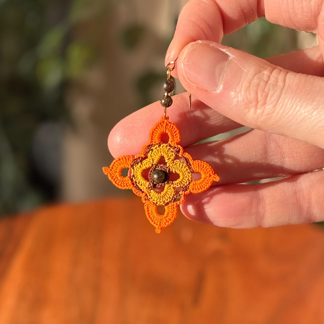 Ces boucles d’oreilles sont réalisées en micro-crochet avec un fil de coton extrêmement fin et un crochet de 0,60 mm. Le motif, a été travaillé point par point, une mélange de patience et de précision.
