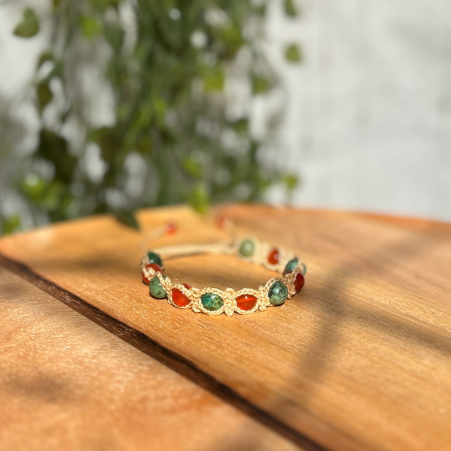 La turquoise africaine accompagne les périodes de changement avec confiance. La cornaline stimule l’énergie et soutient la créativité. Ensemble, ces pierres symbolisent l’équilibre et l’ancrage dans l’instant présent.