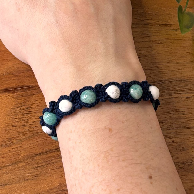 Crocheté à la main avec un fil de coton mercerisé bleu marine, ce modèle Dharma est orné de perles d’howlite et d’amazonite.