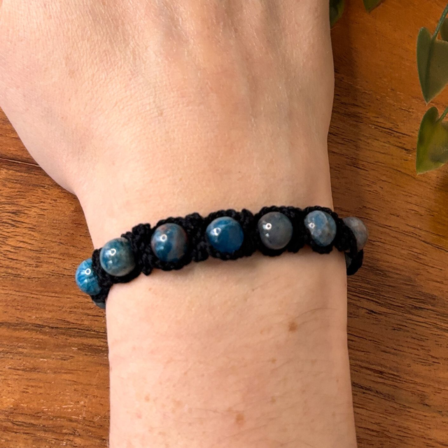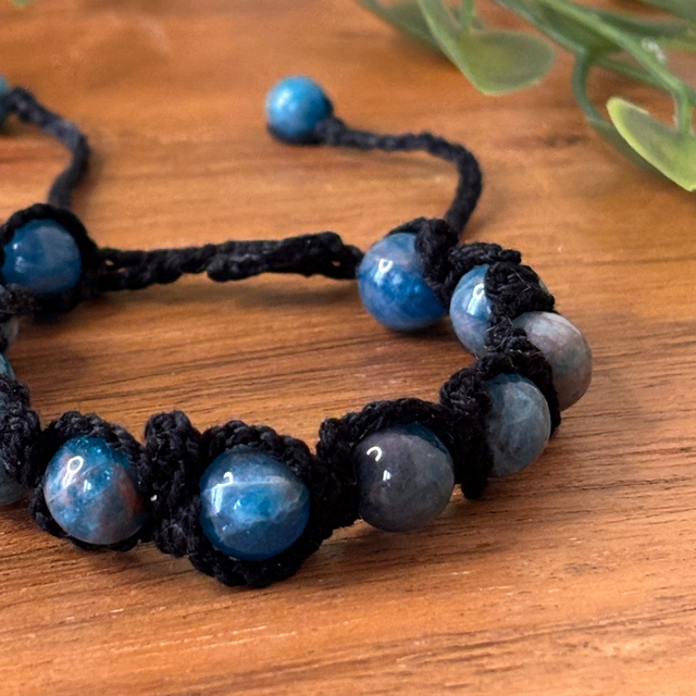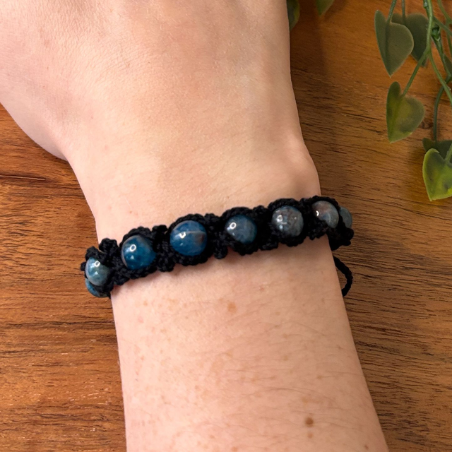 Crocheté à la main avec un fil de coton mercerisé noir, ce modèle Dharma est orné de perles d’apatite bleue.